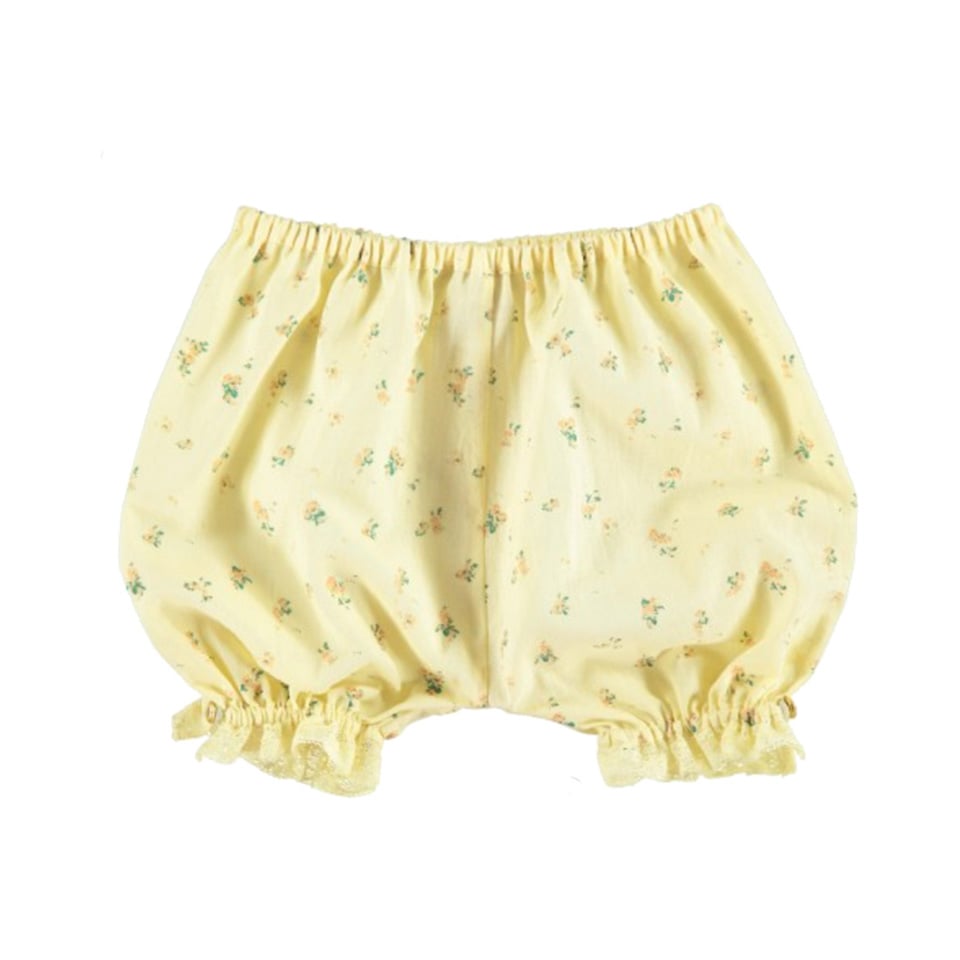 Special puffer shorts, with a sweet lace trimming and beautiful floral print all over a light, delicate yellow background. Elastic waist to easily slip on and off.